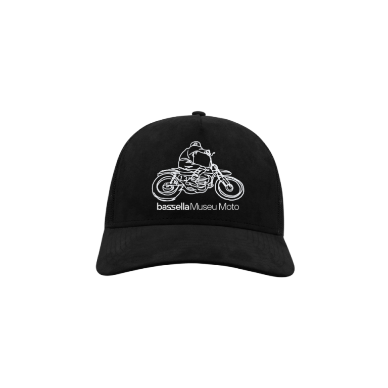 Gorra 100% poliester que forma parte de la colección BASSELLA X FIKA. De color negro y con ilustración personalizada del Museu Moto Bassella.