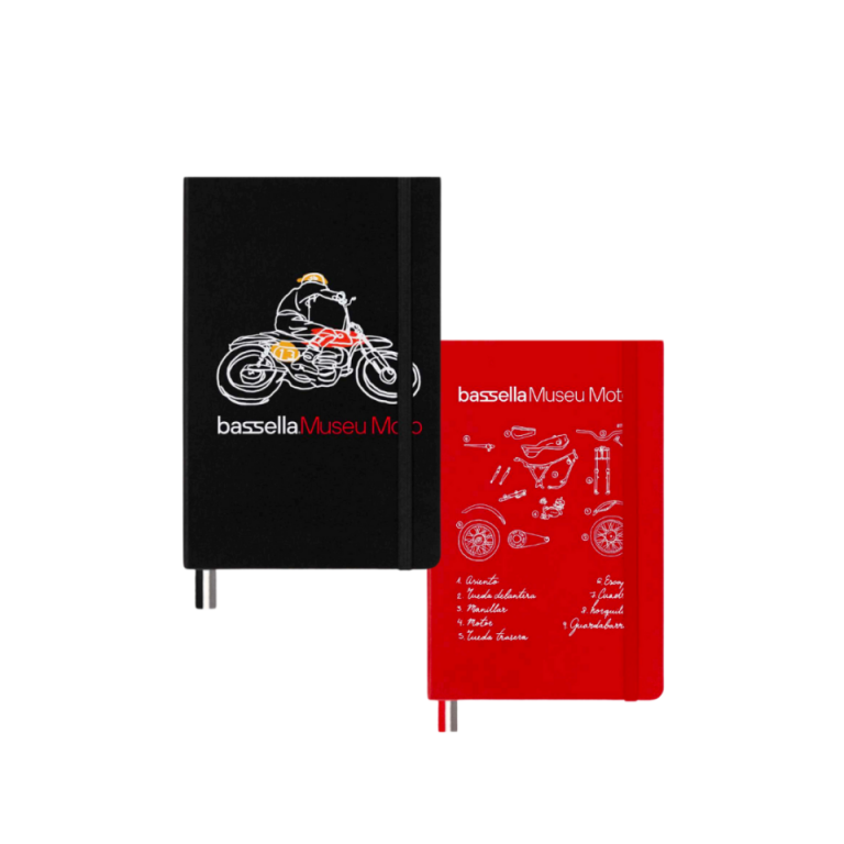 Libretas que forman parte de la colección BASSELLA X FIKA. De color rojo y negro con ilustración personalizada del Museu Moto Bassella.